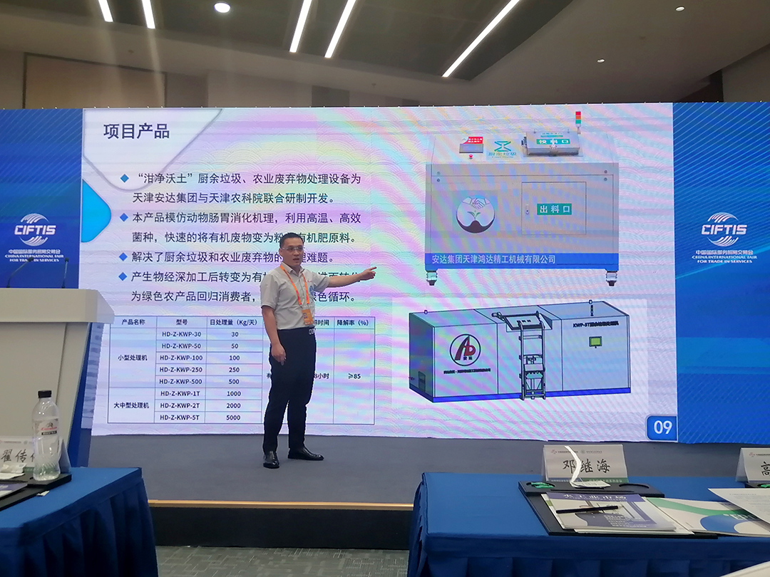 推介会上,鸿达精工副总经理庄儒国详细介绍了安达集团的最新绿色环保项目 —“泔净沃土” 牌厨余垃圾及农业废物处理设备。他通过深入阐释两大系列产品的应用与推广优势,生动而形象地还原了绿色低碳环保设备的卓越特性,并对该项目的闭环发展进行了全面且细致的阐述。